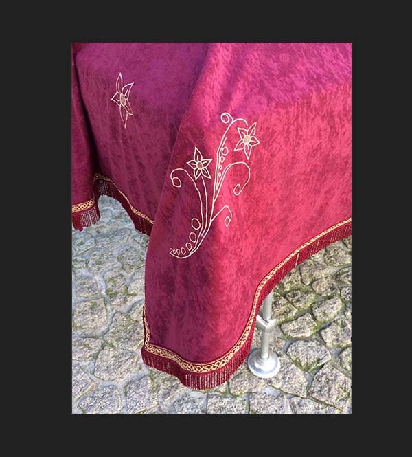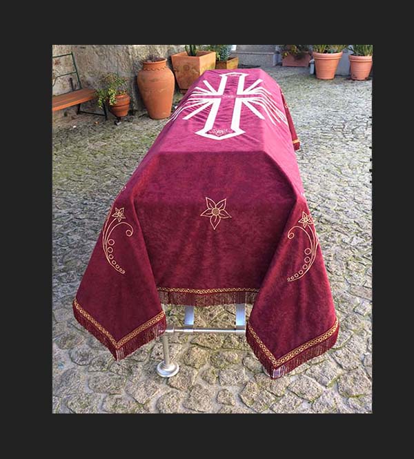Pano Funerário de Pele Pêssego, decorado com galões dourados ou prateados, com bordados prateados ou dourados. Presente artigo poderá ser vendido em diferentes cores à escolha do cliente.